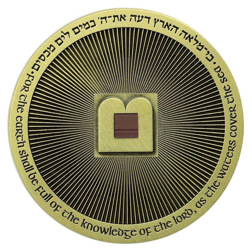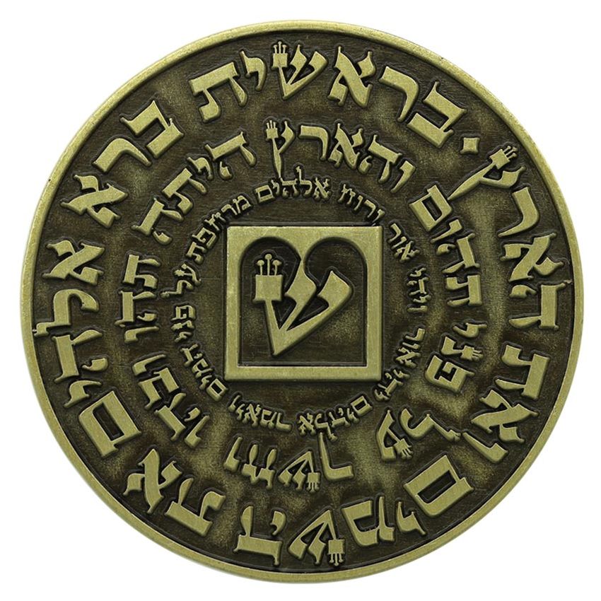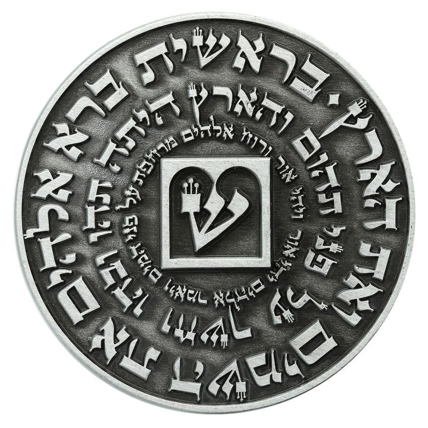 The reverse is inscribed with the first three verses of the Book of Genesis, the foundational account of creation. The text spirals inward, drawing the viewer's eye from the cosmic scale of creation toward the central, creative spark. The blocky, artistic font is reminiscent of ancient stone inscriptions, grounding the modern coin in a sense of deep historical permanence.