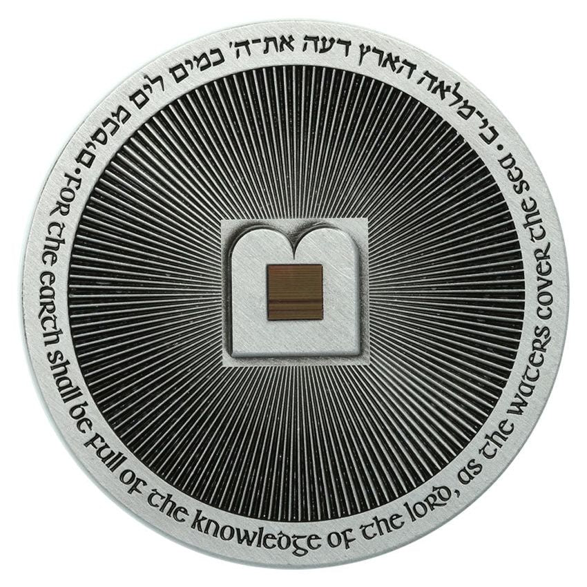 This silicon chip, visible within its housing, contains the complete, digitally engraved text of the Hebrew Bible (Tanakh). It represents the coin's core theme: the convergence of millennia of sacred tradition with the pinnacle of modern miniaturization technology. The physical text, the source of all knowledge depicted, is literally embedded at the heart of the design.