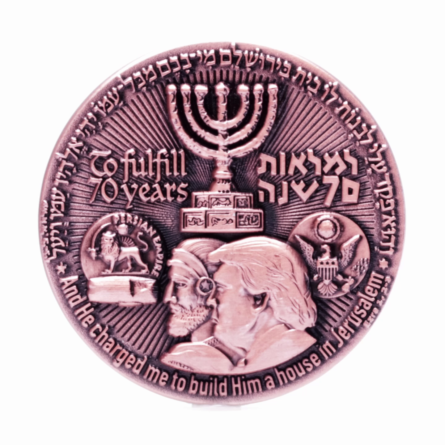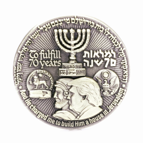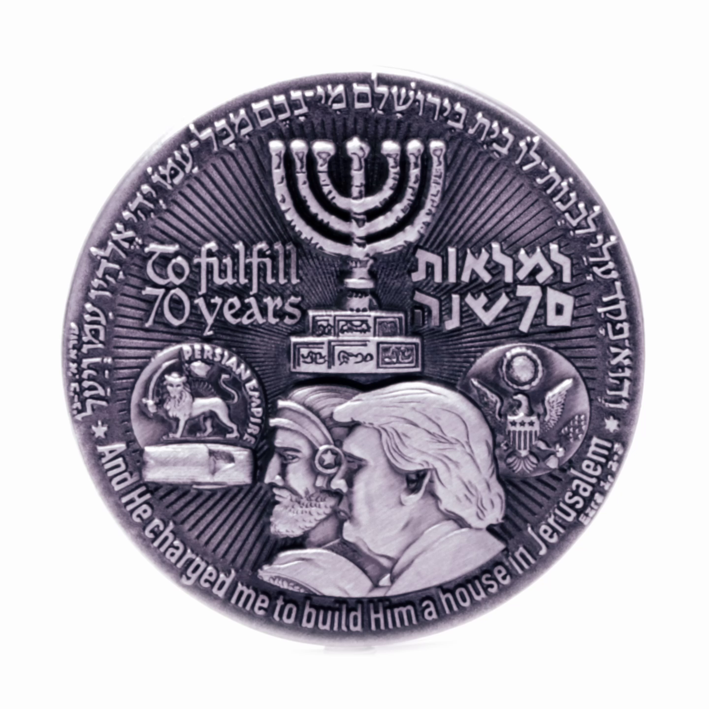 The conjoined profiles of King Cyrus the Great of Persia (left) and the 45th U.S. President, Donald Trump (right), form the coin's central image. Cyrus's Edict in 538 BCE permitted the Jews to return to Judah and rebuild the Temple, ending a 70-year exile. The coin presents President Trump's 2018 decision to recognize Jerusalem as Israel's capital and move the U.S. embassy there as a modern parallel, occurring 70 years after the state's founding.
