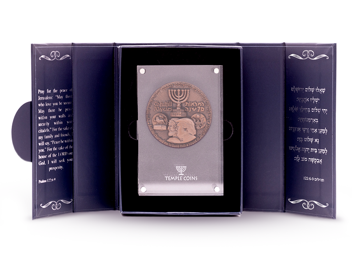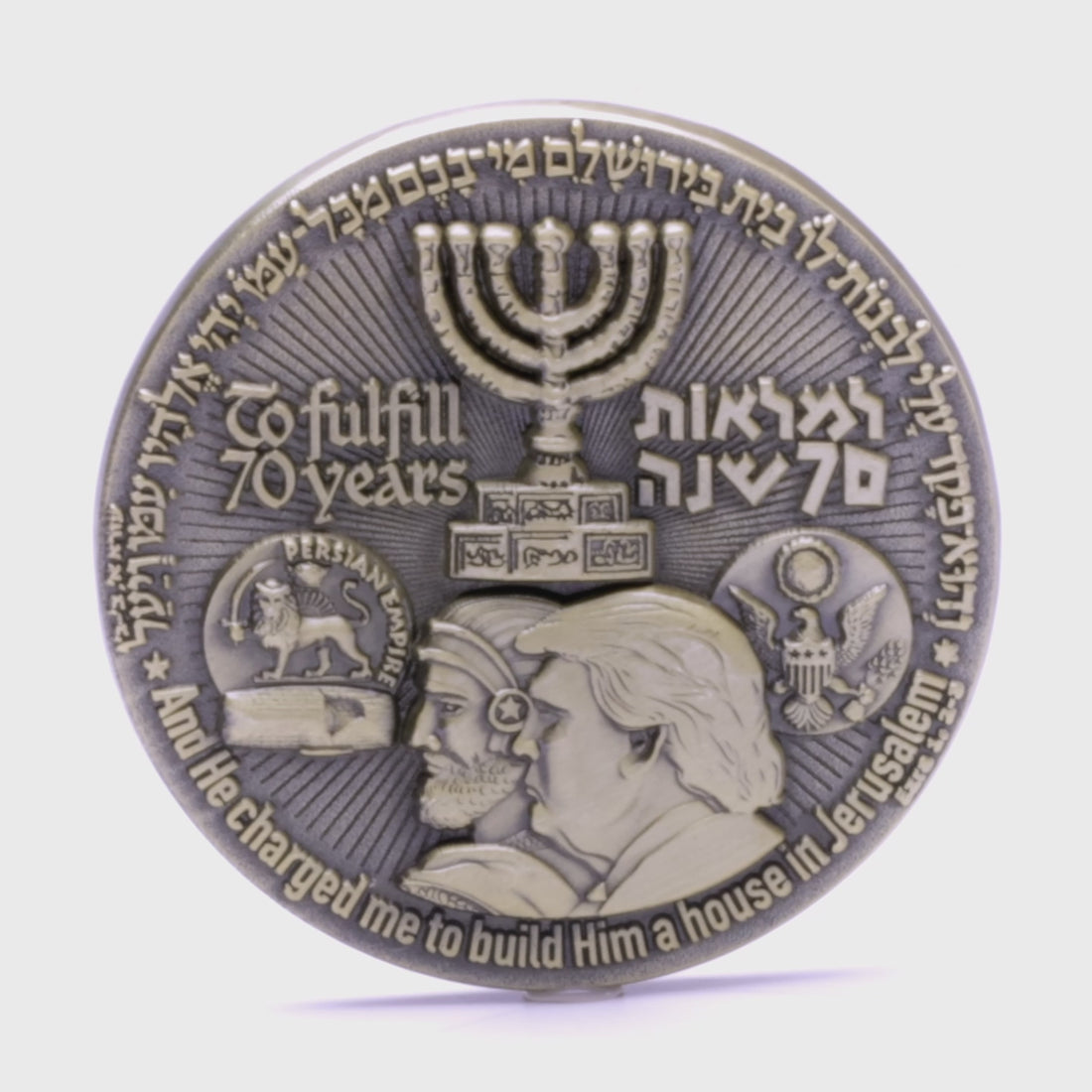 This coin highlights the parallel 70-year mandates of King Cyrus and President Trump for Jerusalem's restoration, framing these historical acts within the biblical narrative of promise and fulfillment.