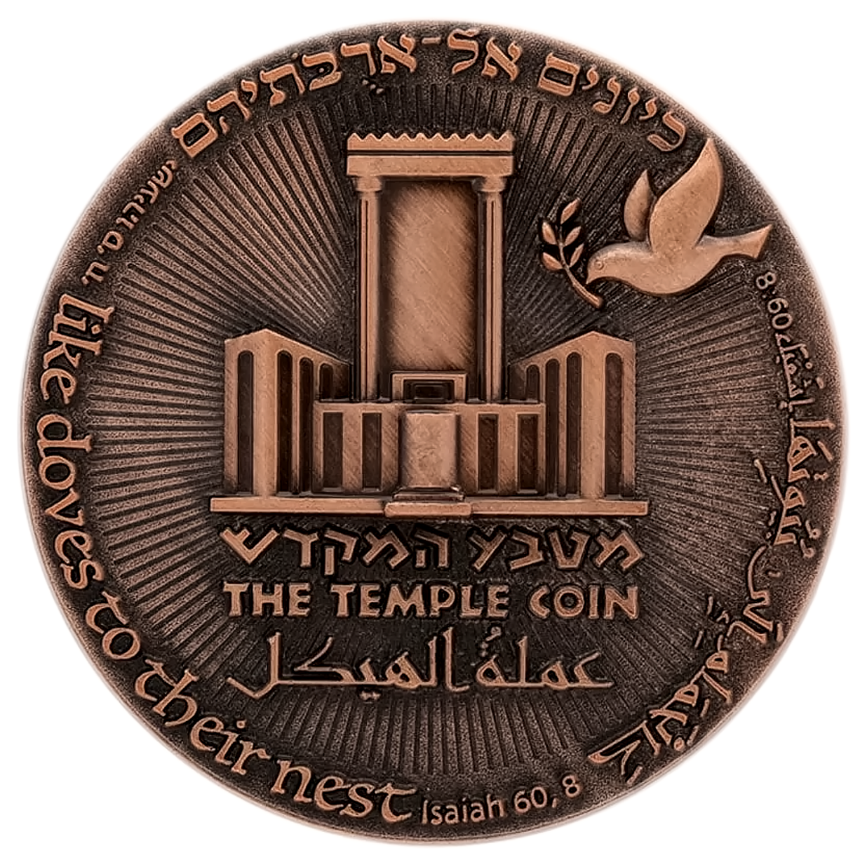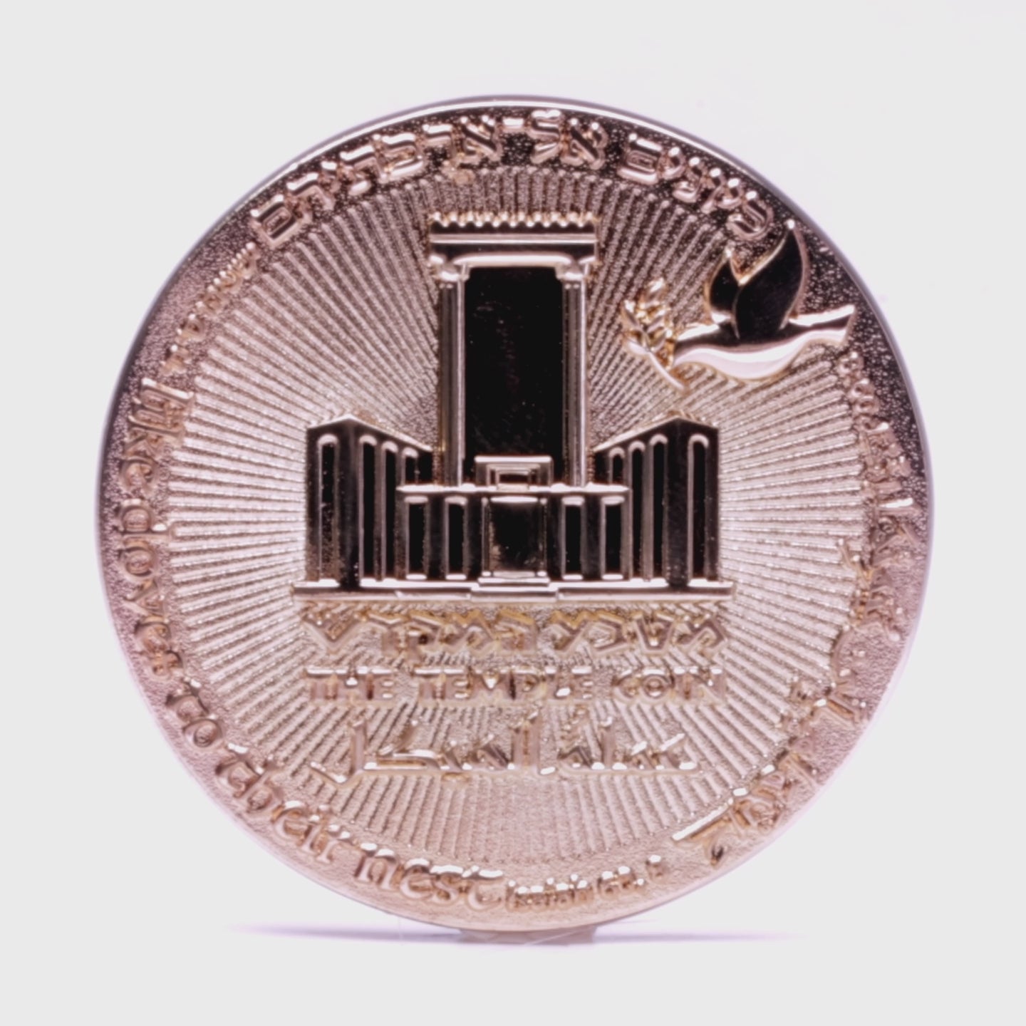 The reverse is dominated by a depiction of the future Holy Temple, based on the detailed vision of the prophet Ezekiel (chapters 40-48). This is not the historical First or Second Temple, but the prophesied Third Temple, a symbol of ultimate redemption and messianic promise. Its presence signifies the hope that current events are a step toward a complete, prophetic fulfillment.