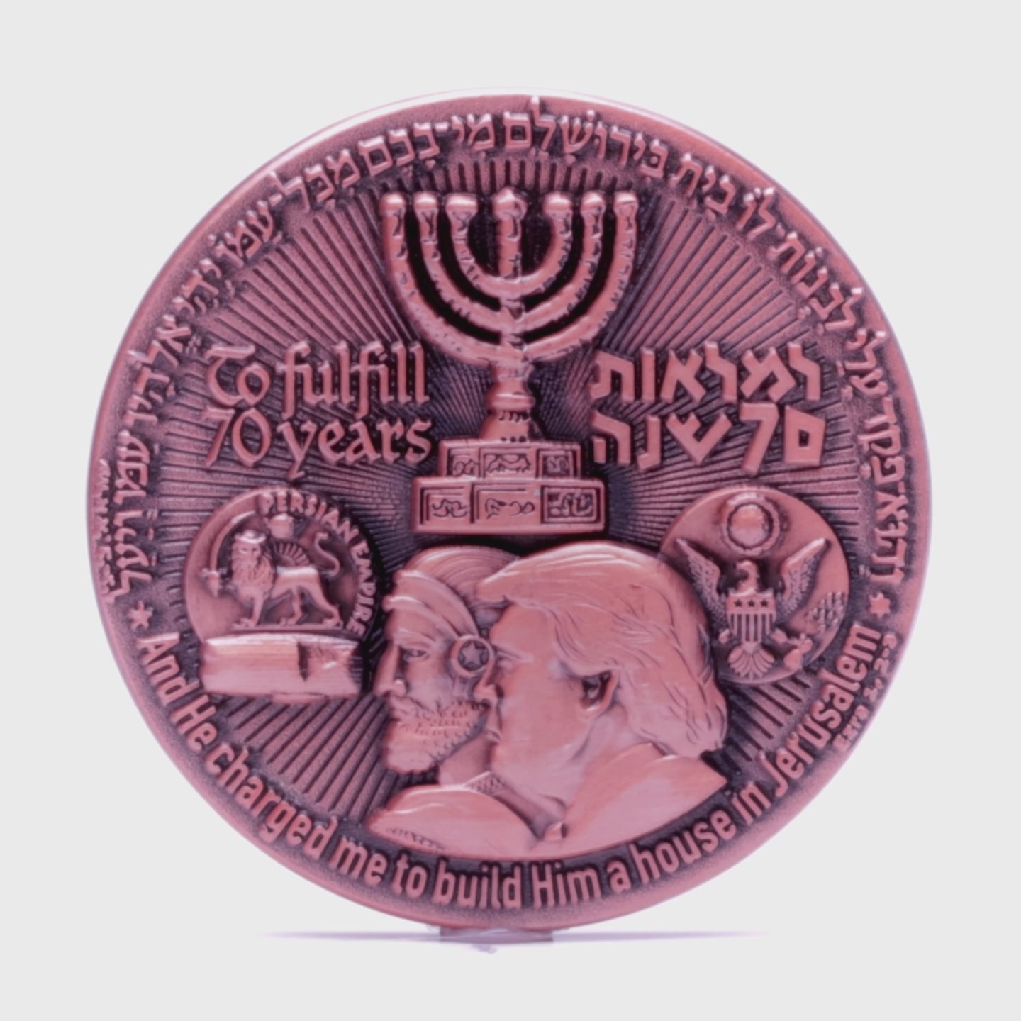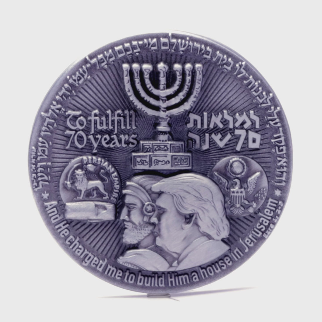The conjoined profiles of King Cyrus the Great of Persia (left) and the 45th U.S. President, Donald Trump (right), form the coin's central image. Cyrus's Edict in 538 BCE permitted the Jews to return to Judah and rebuild the Temple, ending a 70-year exile. The coin presents President Trump's 2018 decision to recognize Jerusalem as Israel's capital and move the U.S. embassy there as a modern parallel, occurring 70 years after the state's founding.