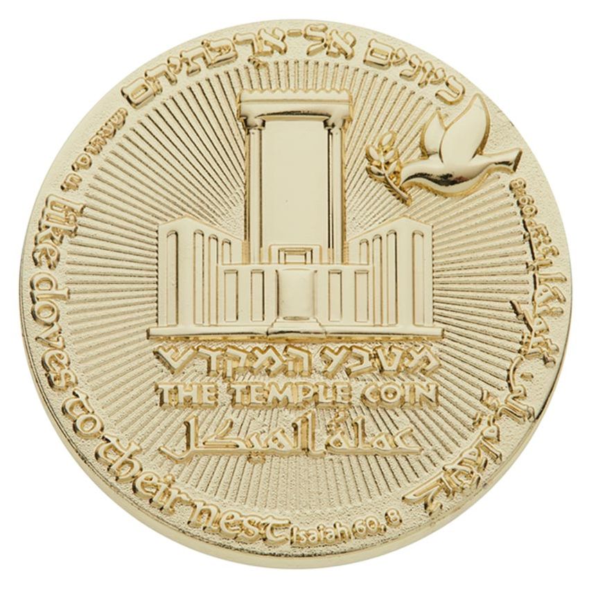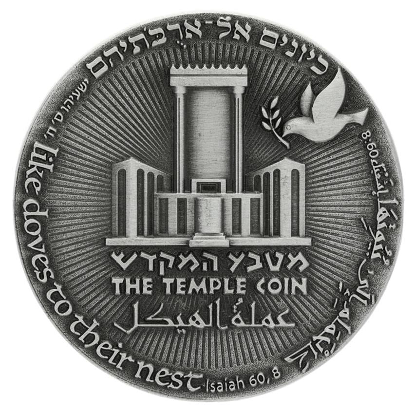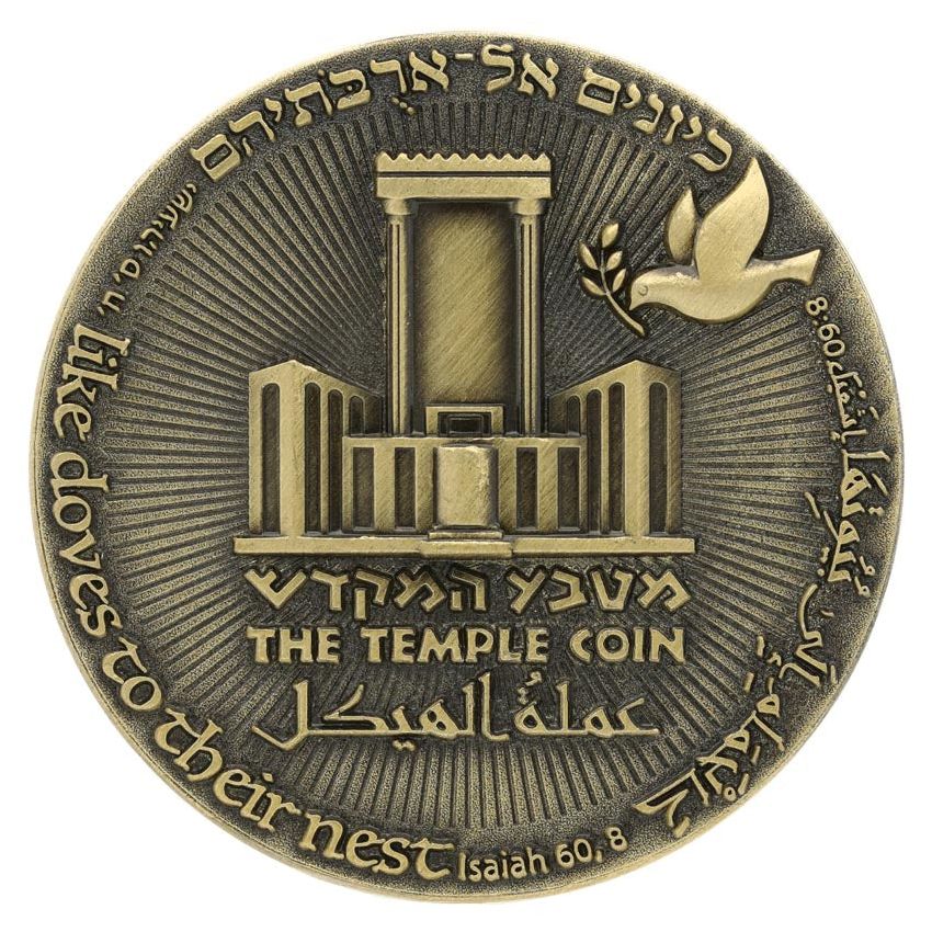 The reverse is dominated by a depiction of the future Holy Temple, based on the detailed vision of the prophet Ezekiel (chapters 40-48). This is not the historical First or Second Temple, but the prophesied Third Temple, a symbol of ultimate redemption and messianic promise. Its presence signifies the hope that current events are a step toward a complete, prophetic fulfillment.