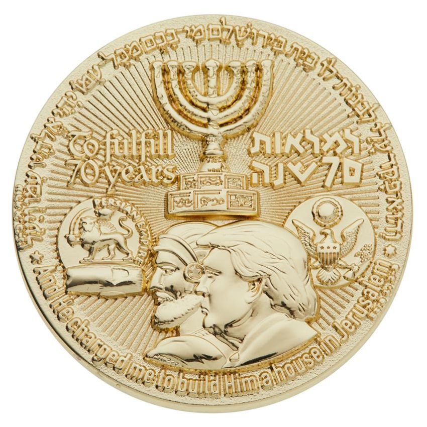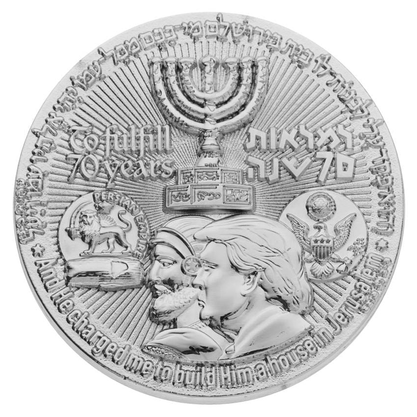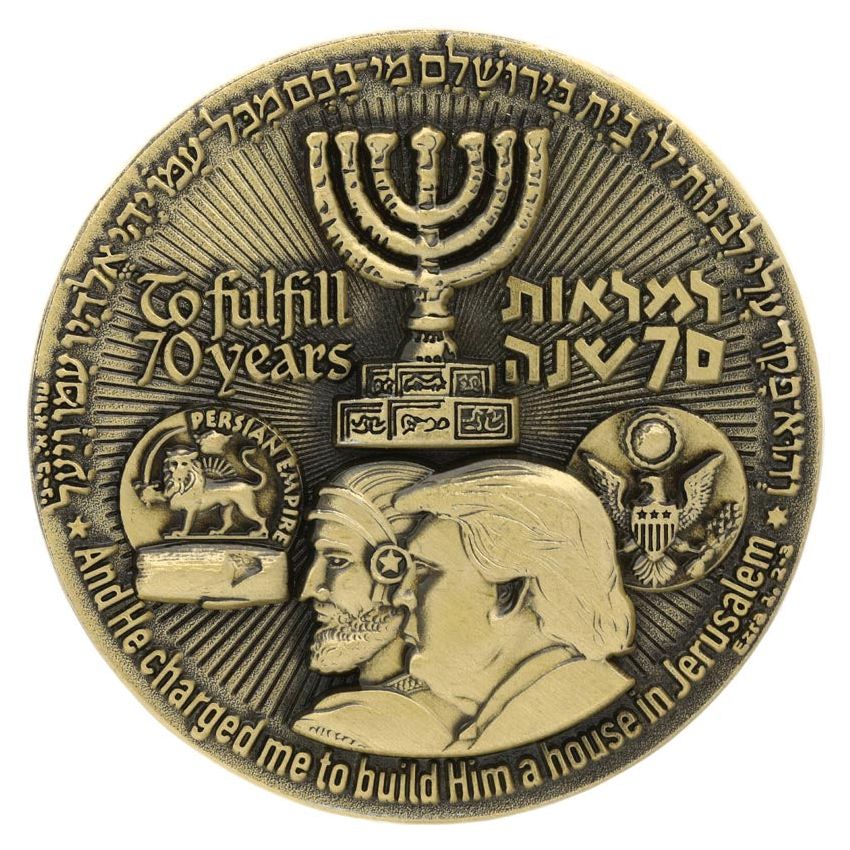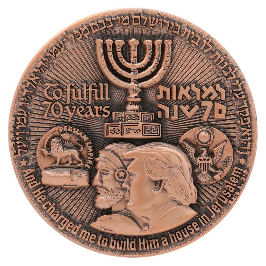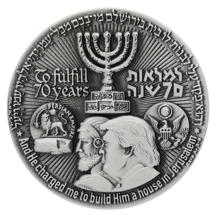 The conjoined profiles of King Cyrus the Great of Persia (left) and the 45th U.S. President, Donald Trump (right), form the coin's central image. Cyrus's Edict in 538 BCE permitted the Jews to return to Judah and rebuild the Temple, ending a 70-year exile. The coin presents President Trump's 2018 decision to recognize Jerusalem as Israel's capital and move the U.S. embassy there as a modern parallel, occurring 70 years after the state's founding.