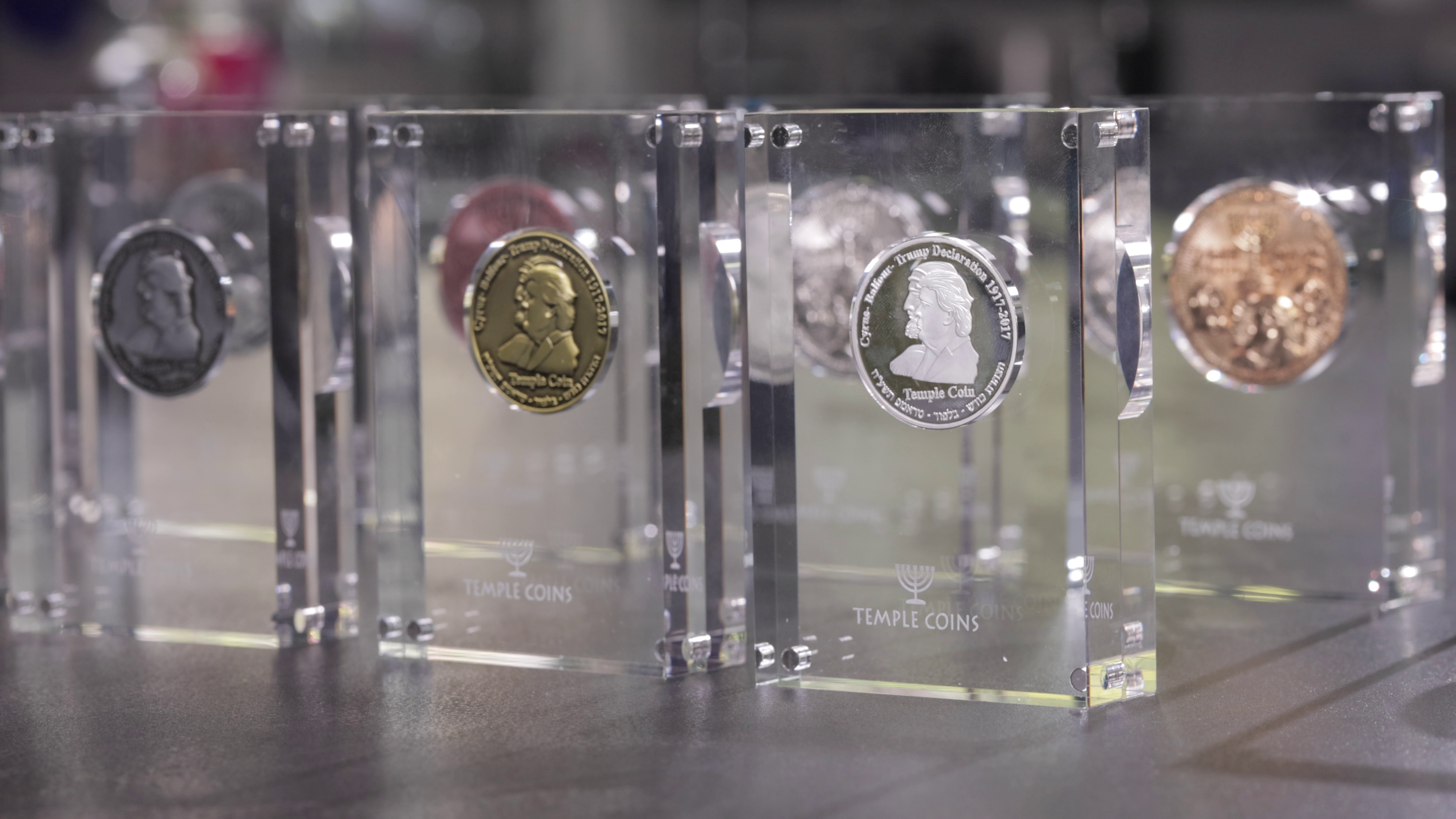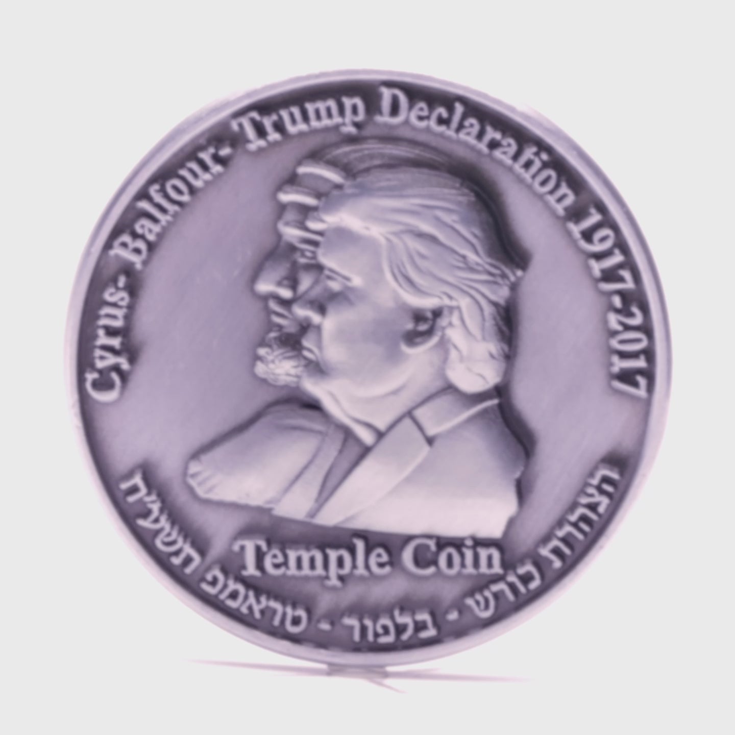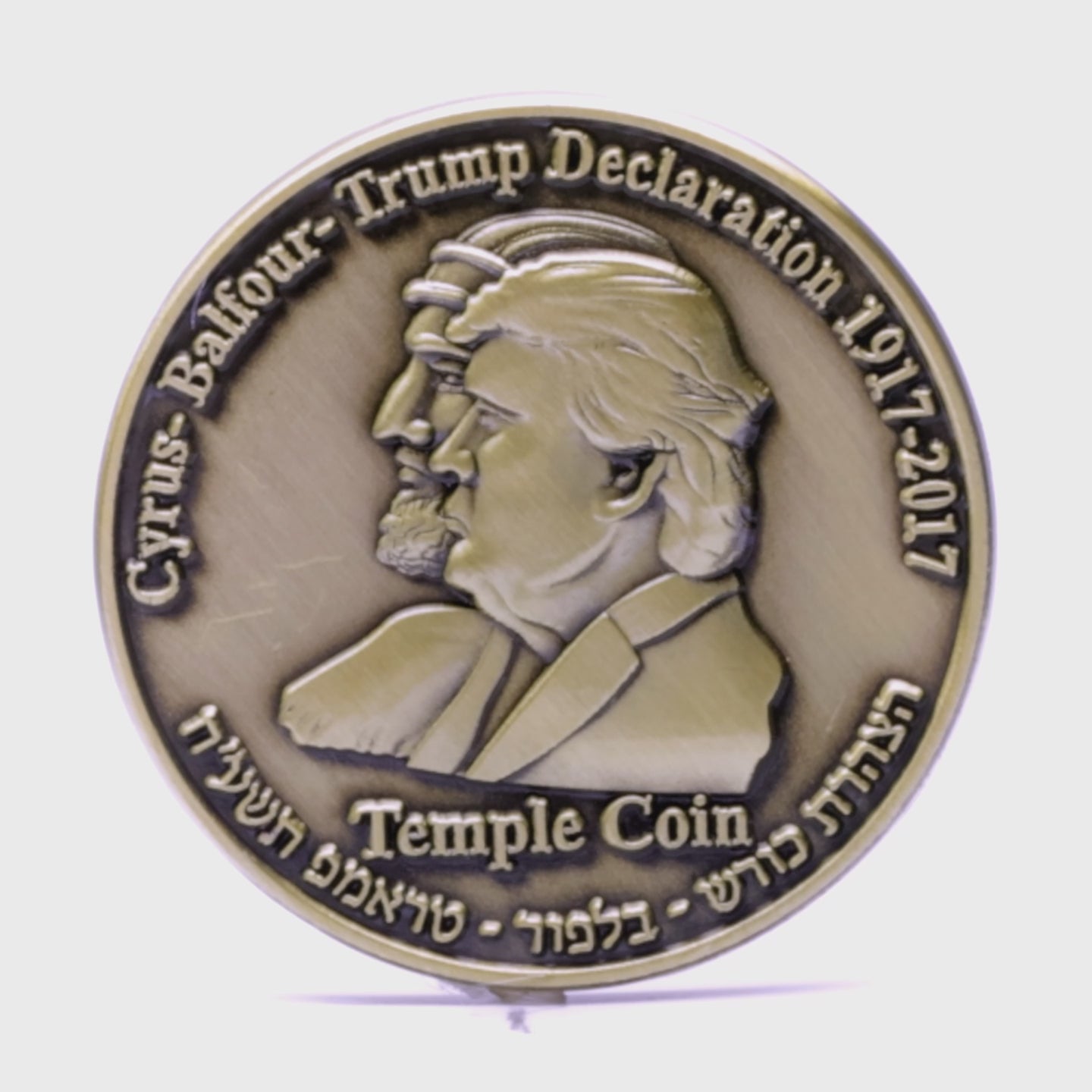 The conjoined profiles of King Cyrus of Persia and U.S. President Donald J. Trump appear at the center of the coin's obverse. This design choice creates a direct visual link between two world leaders who, though separated by more than 2,500 years, are recognized for their pivotal declarations concerning Jerusalem. Cyrus the Great, the founder of the Achaemenid Empire, famously issued a decree in the 6th century BCE that permitted the Jewish people to return to Judah from their Babylonian exile and rebuild their Temple. In 2017, President Trump formally recognized Jerusalem as the capital of Israel and initiated the process of moving the U.S. embassy there. The pairing of their portraits on this coin serves to frame these two actions as parallel moments in a long historical and divine narrative of Jerusalem's restoration.