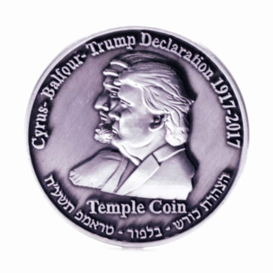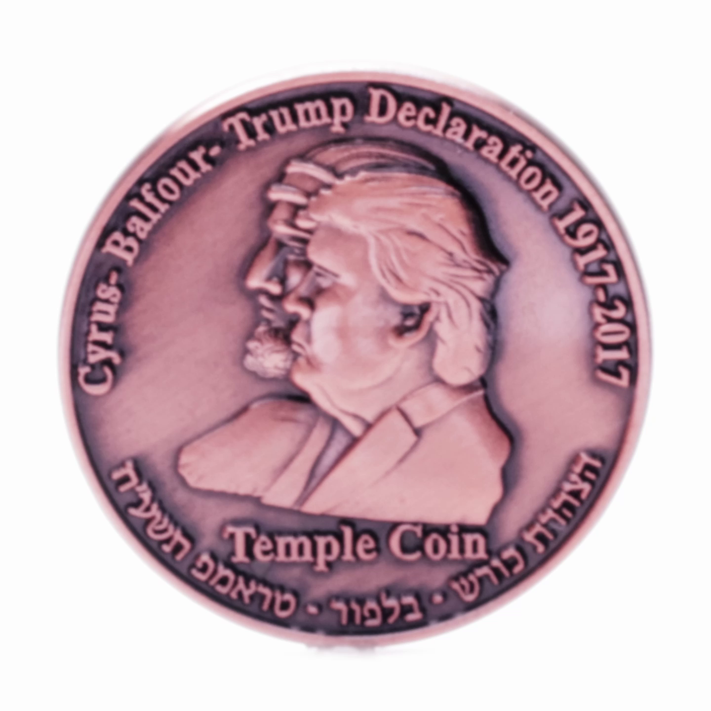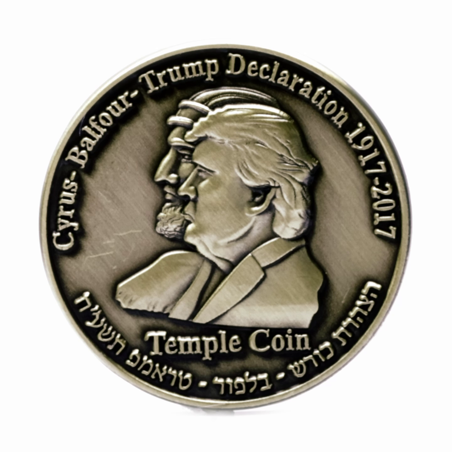 The conjoined profiles of King Cyrus of Persia and U.S. President Donald J. Trump appear at the center of the coin's obverse. This design choice creates a direct visual link between two world leaders who, though separated by more than 2,500 years, are recognized for their pivotal declarations concerning Jerusalem. Cyrus the Great, the founder of the Achaemenid Empire, famously issued a decree in the 6th century BCE that permitted the Jewish people to return to Judah from their Babylonian exile and rebuild their Temple. In 2017, President Trump formally recognized Jerusalem as the capital of Israel and initiated the process of moving the U.S. embassy there. The pairing of their portraits on this coin serves to frame these two actions as parallel moments in a long historical and divine narrative of Jerusalem's restoration.