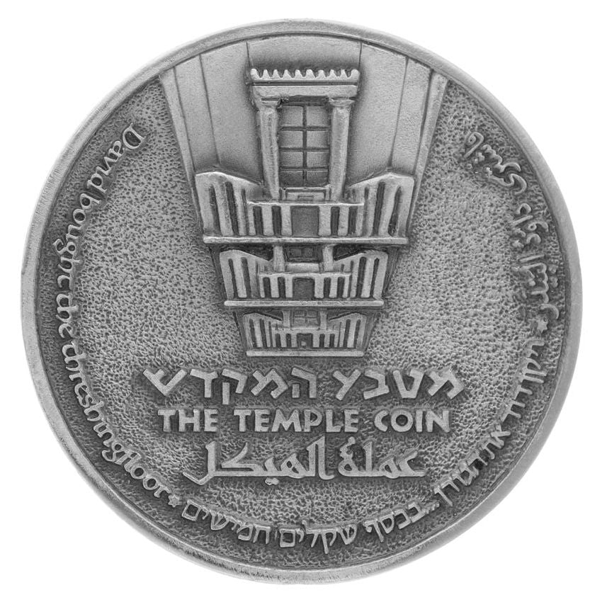 * **Significance:** This act establishes the sacred site of the future Temple through a legitimate, honorable transaction. It teaches that offerings to God require a meaningful sacrifice. By placing this verse on the coin, it connects the hope for a future Temple directly to King David's foundational act of acquiring the land with integrity. The inscription is also rendered in English ("David bought the threshingfloor") and Arabic, underscoring the historical nature of the claim to this holy place.
