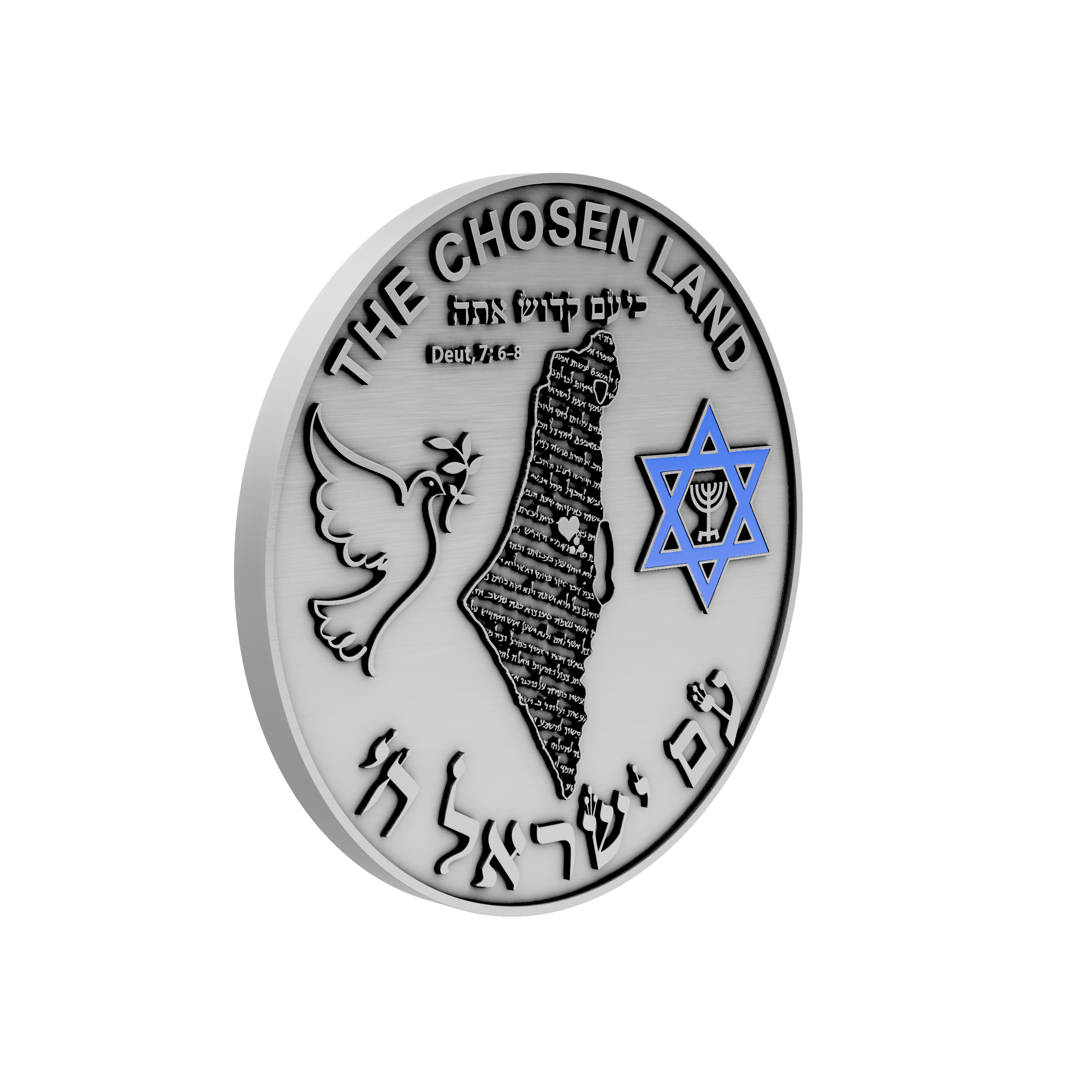 The coin displays a map of modern Israel, a clear symbol of national sovereignty and the Jewish people's return to their ancestral homeland. The map is not empty; it is filled with Hebrew text, visually merging the physical land with the divine promise that sanctifies it. This design powerfully suggests that the nation's existence is rooted in and sustained by its covenant with God.
