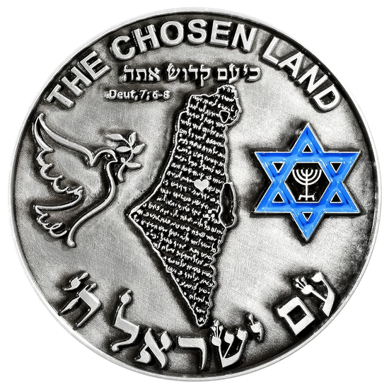 The coin displays a map of modern Israel, a clear symbol of national sovereignty and the Jewish people's return to their ancestral homeland. The map is not empty; it is filled with Hebrew text, visually merging the physical land with the divine promise that sanctifies it. This design powerfully suggests that the nation's existence is rooted in and sustained by its covenant with God.